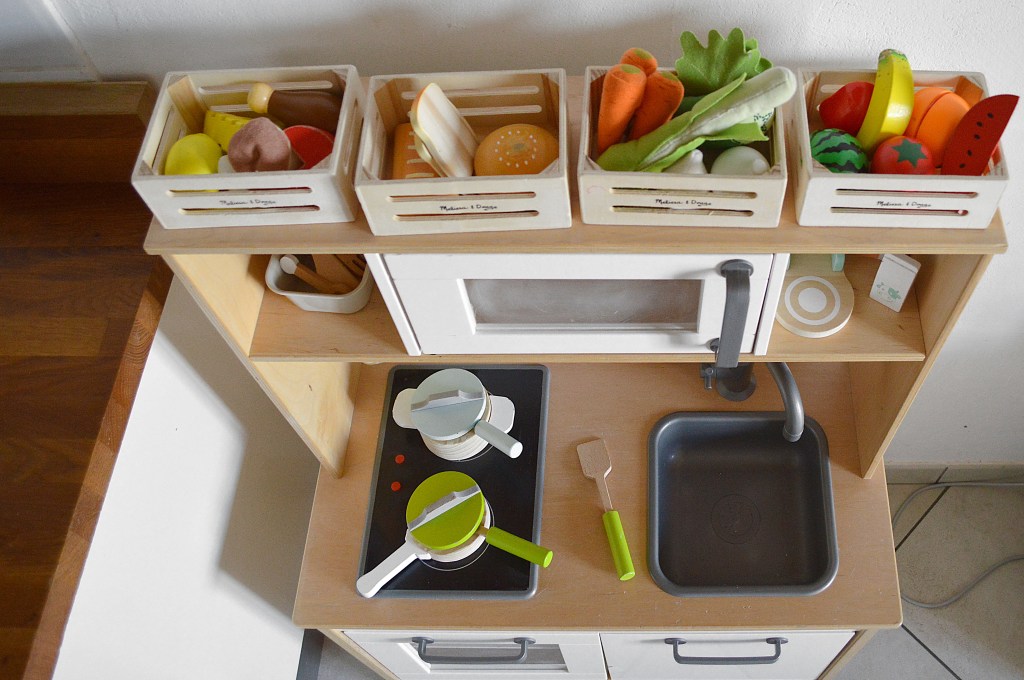 We put Sophie’s kitchen next to ours so we can cook together and sometimes she can really help me cook little things or little desserts.
